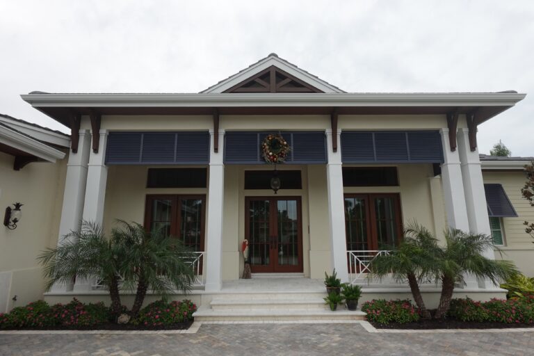 Azek Bahama Shutters (Blue shutters) Foam Brackets (Grey Brown color) Azek Address Plaque